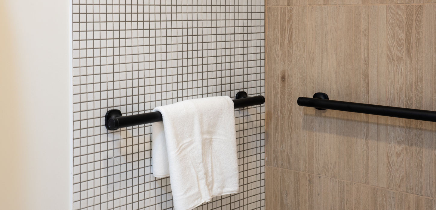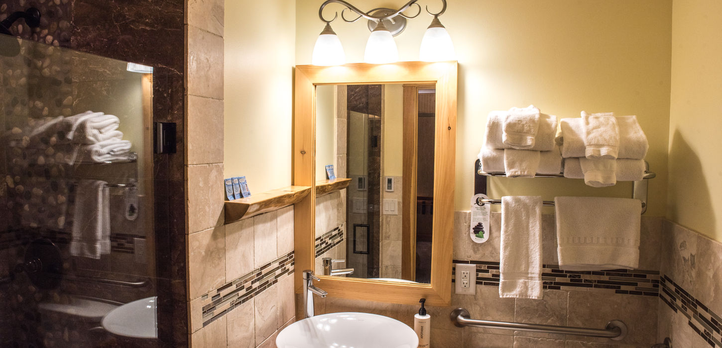 Our accessible queen rooms offer the same comfort, warmth, and elevated lodge feel as our standard rooms, with thoughtful accessible features to ensure a relaxed and effortless stay. Designed for guests who prefer or require additional space and convenience, this room includes two plush queen beds and an accessible bathroom with a roll-in shower featuring muted-tone tile and a gentle rainfall showerhead.