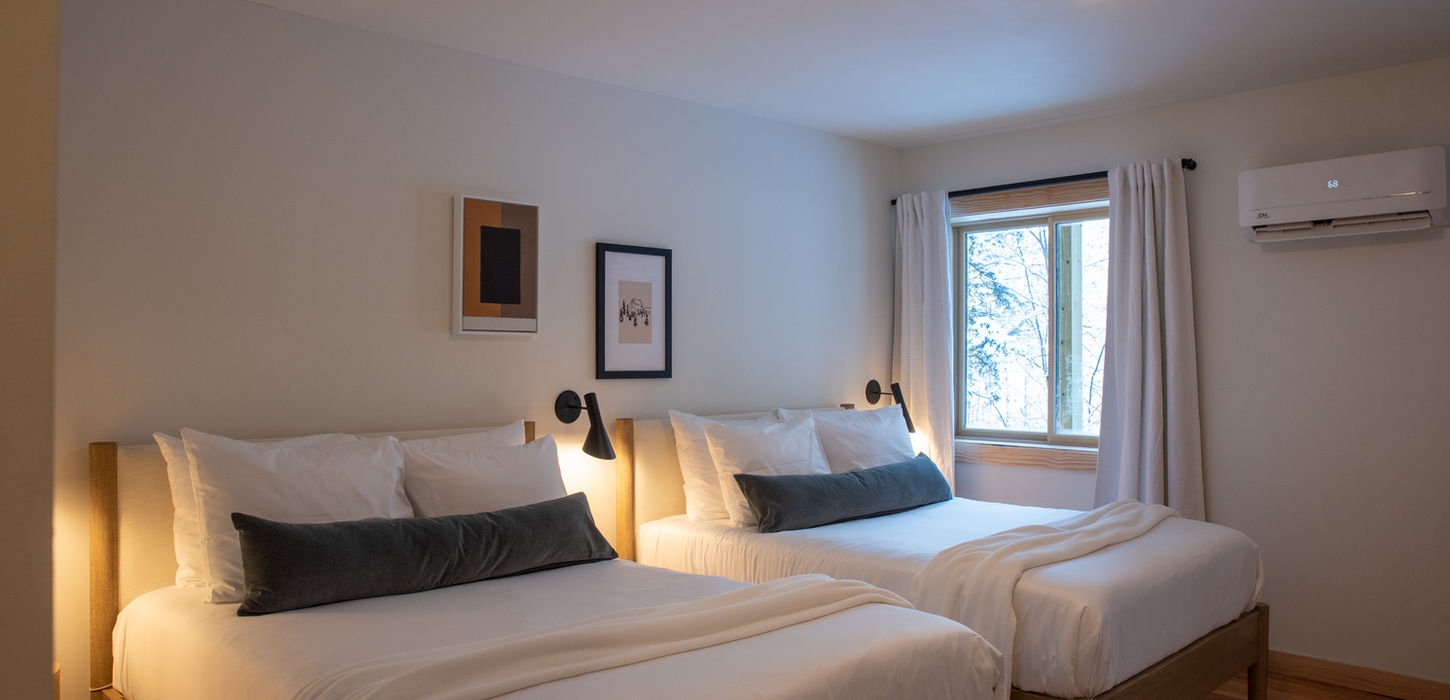 Our newly built Two Double rooms are ideal for friends, families, or travel companions seeking comfort and convenience. Thoughtfully designed with refined Adirondack character, these rooms feature two plush double beds and a well-appointed bathroom with muted-toned tile finishes. With modern finishes throughout and easy access, this room offers a comfortable, relaxed stay after a day in the mountains.