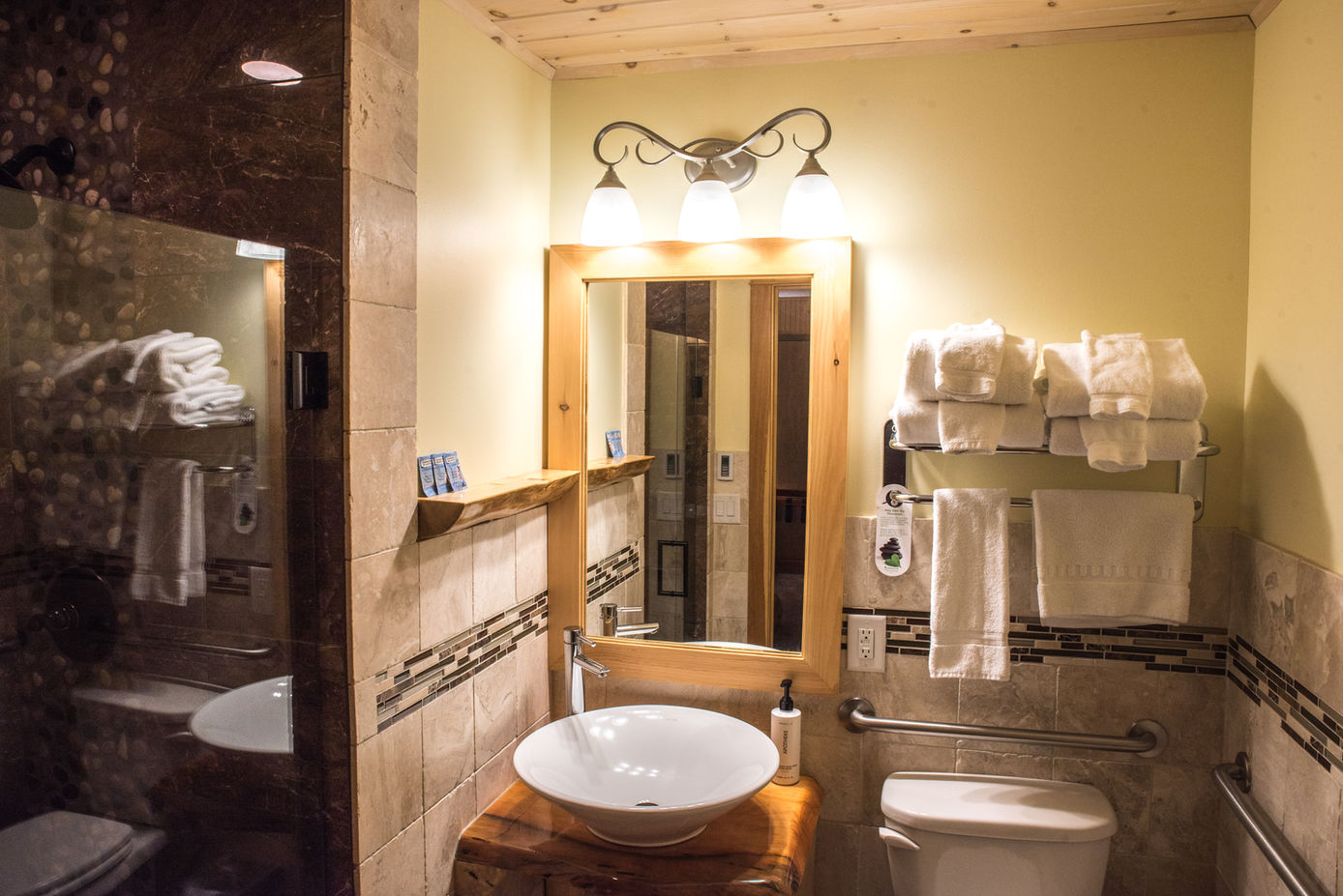 At Adirondack Spruce Lodge, each room is designed to be a calming refuge after your time in the mountains. Enjoy plush mattresses, spacious bathrooms with muted stone and tile finishes, 49-inch HD TVs, and rich Adirondack décor that brings rustic warmth to elevated comfort. Traveling as a couple, with friends, or with family, our well-appointed rooms offer a relaxing, cozy stay with all the comforts you expect and the charm you come for.