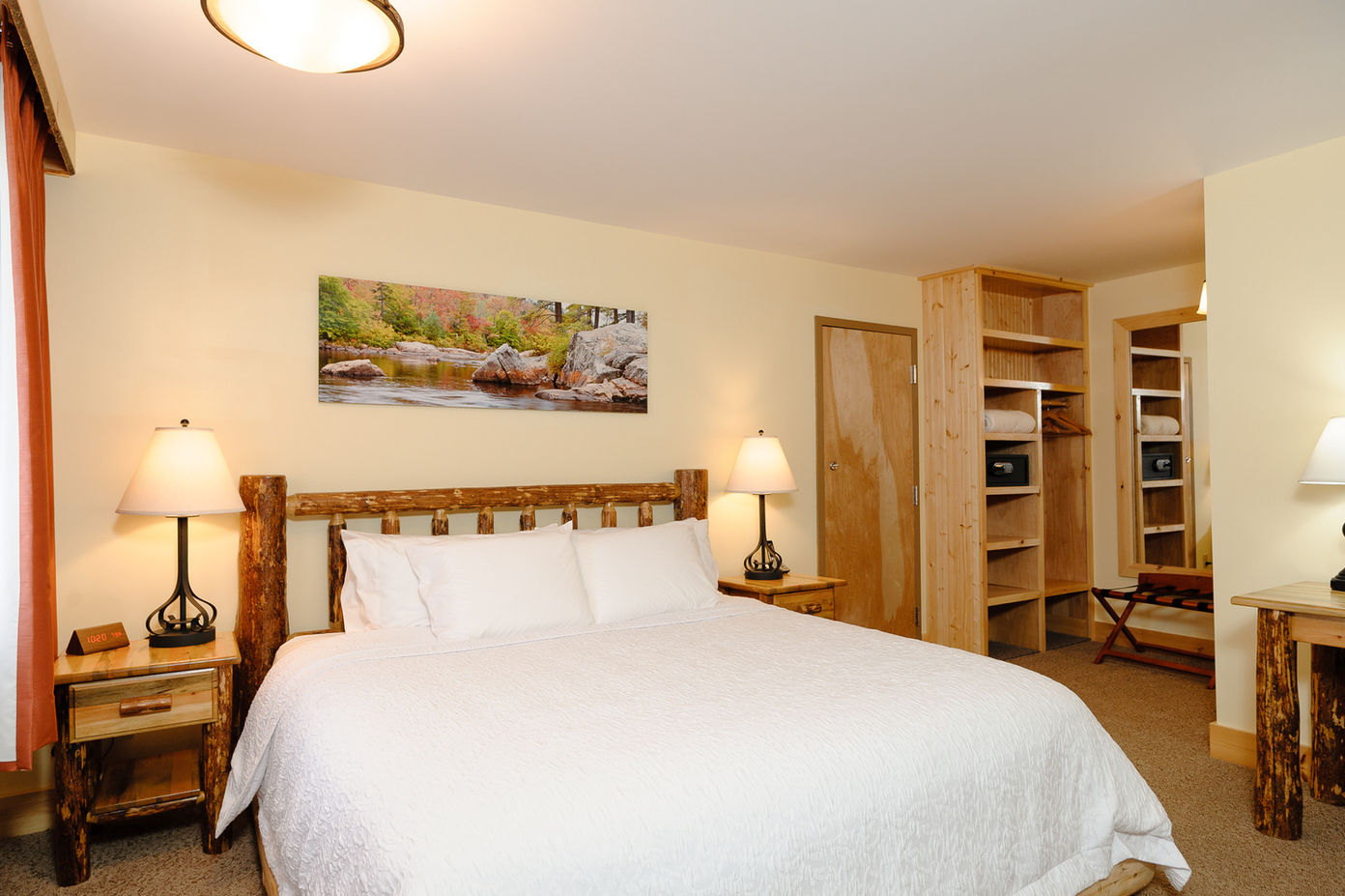 Designed with ease and comfort in mind, the Accessible King room offers refined Adirondack style with thoughtfully integrated accessibility features. This newly built accommodation features a plush king bed and a spacious, accessible bathroom with a roll-in shower finished in muted-toned tile, creating a relaxed and effortless stay for guests seeking both comfort and functionality.