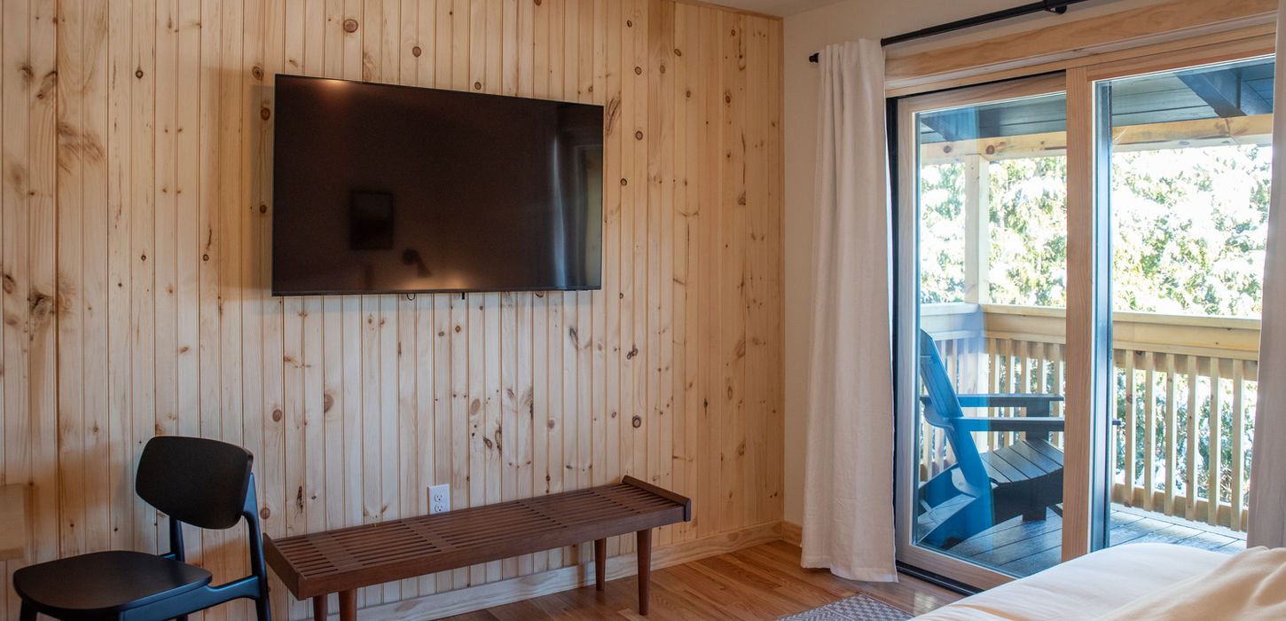 Our newly built King with Balcony & Mountain View rooms offer an elevated Adirondack experience from the second floor. Designed with modern lodge finishes, each room features a plush king bed and a patio door that opens to a private, east-facing balcony overlooking Wilmington and the surrounding Adirondack Mountains. Morning light, fresh mountain air, and refined comfort make this an ideal retreat for couples or solo travelers.
